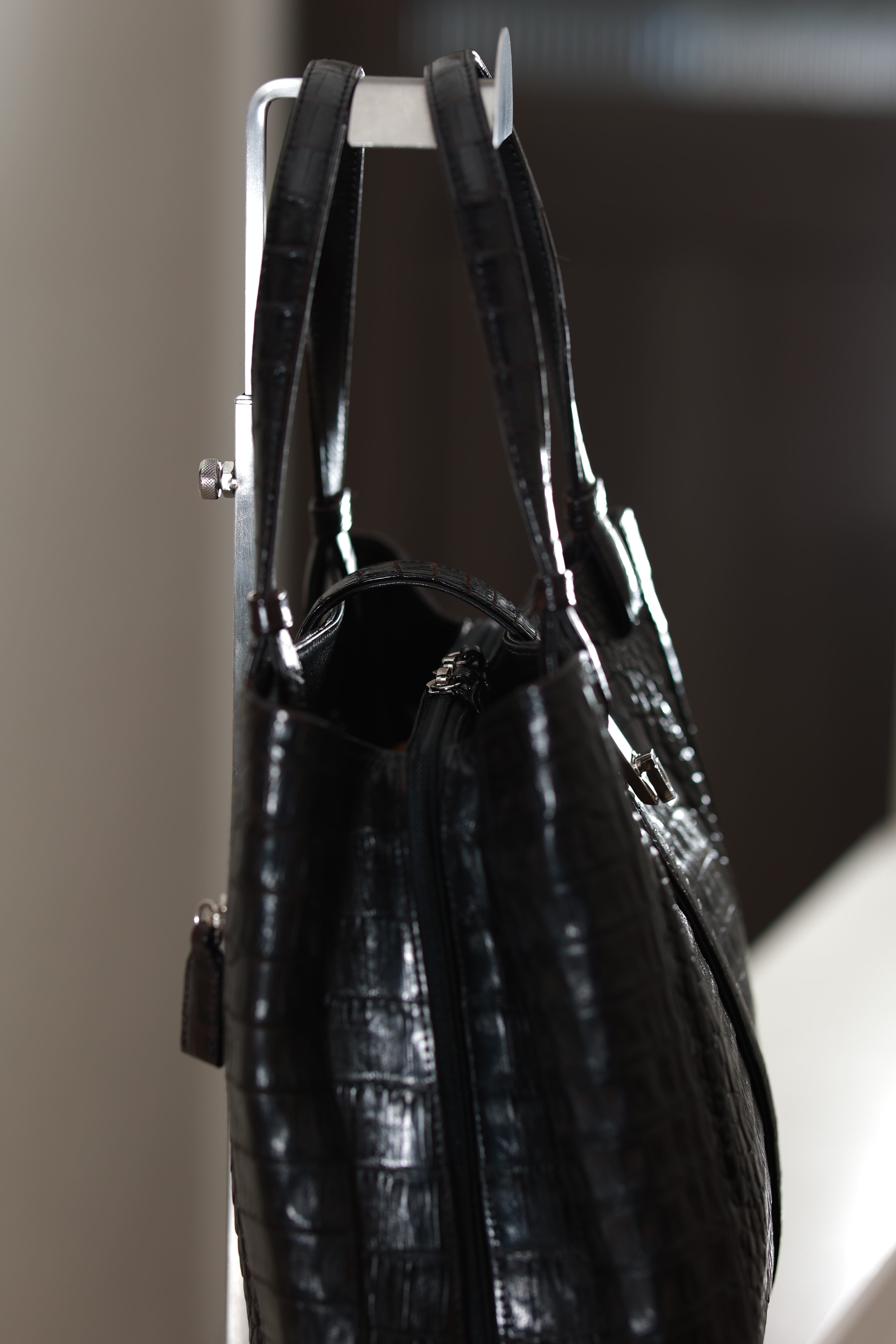 高級感あふれるクロコ型押しデザインのブラックトートバッグ。